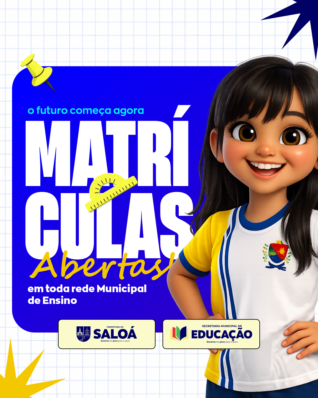 A Prefeitura de Saloá, por meio da Secretaria Municipal de Educação, informa que estão abertas as matrículas para a Rede Municipal de Ensino, garantindo acesso à educação pública, gratuita e de qualidade para crianças e adolescentes do município.